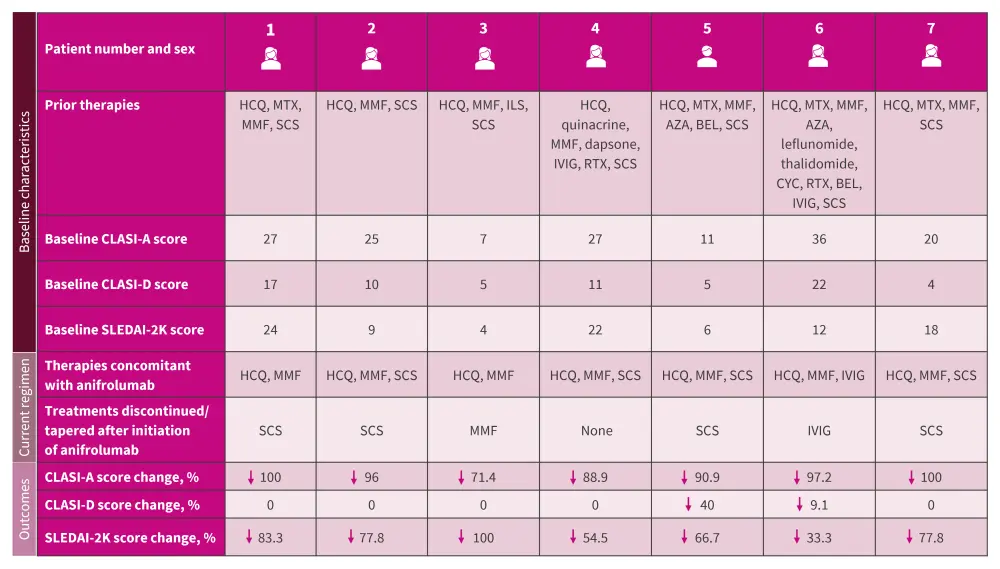 The case series included seven adolescents with DLE with a median age of 17 years (range, 14–20 years), treated intravenously with 300 mg anifrolumab every 4 weeks. Four patients were Asian, two were Black/African American, and one patient was White. The baseline characteristics are presented in Figure 1.