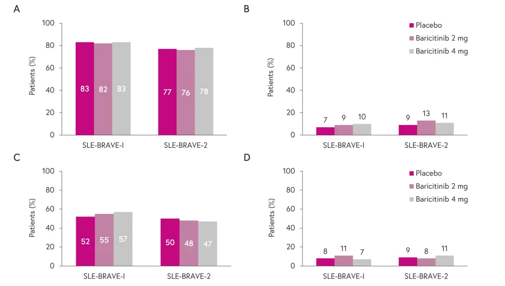 The primary endpoint for both trials was the proportion of patients achieving a SLE Responder Index (SRI)-4 response at Week 52 in the baricitinib 4 mg group compared with placebo group.1,2 Secondary endpoints included: