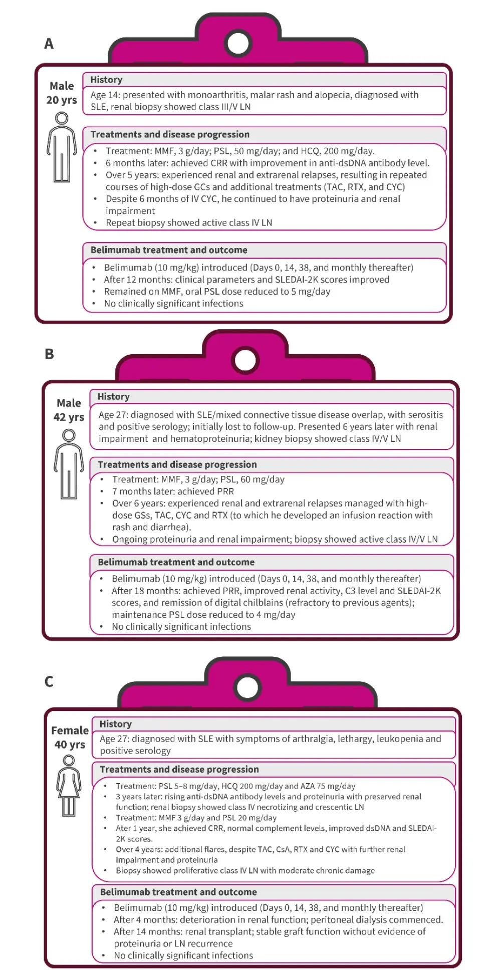 Below, we summarize a case series accessing efficacy and safety of belimumab in three patients with refractory LN, published by Malaweera et al. in Internal Medical Journal.2