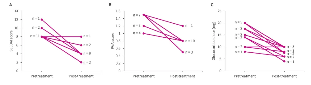 Figure 1. Reduction in A SLEDAI score, B PGA score, and C glucocorticoid use in patients receiving telitacicept after inadequate response with belimumab*