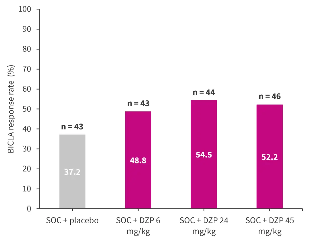 The primary objective was to identify a dose-response relationship across doses of DZP and placebo, based on the primary efficacy endpoint of Week 24 British Isles Lupus Assessment Group (BILAG)-based Composite Lupus Assessment (BICLA) responder rate.1