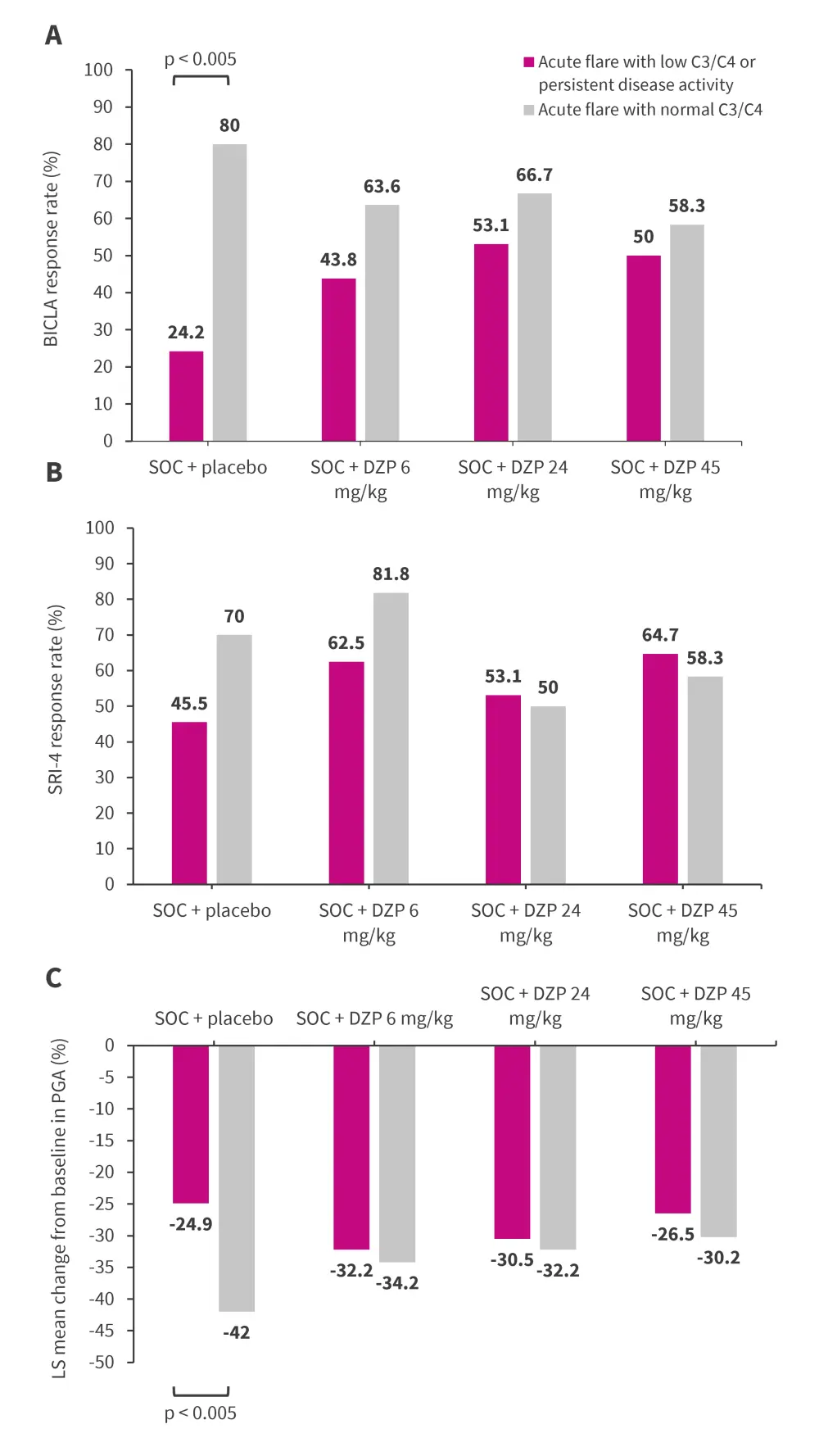 Overall, between those receiving SOC + placebo versus SOC + DZP in the combined subgroups, higher BICLA response rates were achieved across all treatment arms in those patients with acute flare + normal C3/C4 levels when compared with those with acute flare + low C3/C4 levels or persistent disease activity. This pattern was more prominent in patients receiving SOC + placebo, with a significant 3-fold increase in BICLA response between subgroups (80.0% vs 24.2%; p = 0.005; Figure 3A).