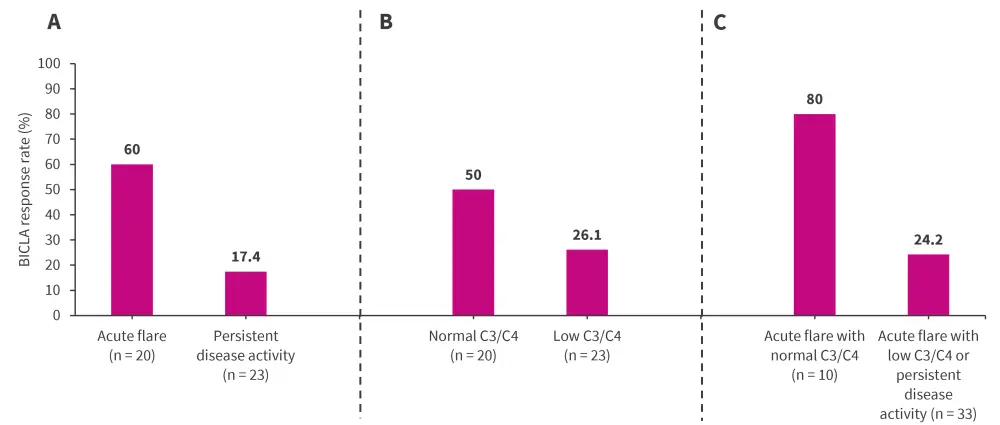 This post-hoc subgroup analysis showed that patients with acute flare and normal complement levels were more likely to achieve a response with SOC + placebo than patients with acute flare and low complement levels or persistent disease activity.