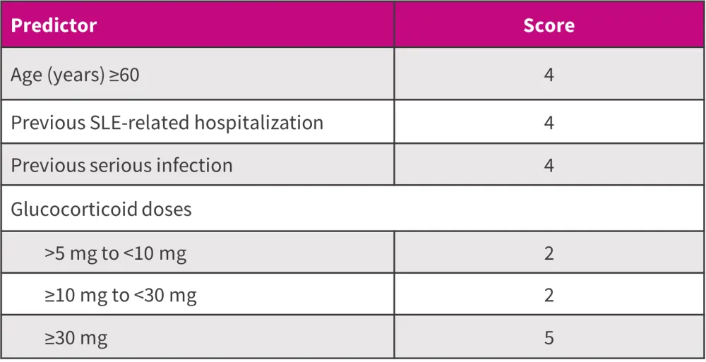 Patients with systemic lupus erythematosus (SLE) have an elevated susceptibility to severe infections.1 While several risk factors have been identified, a clinically useful risk scoring instrument is unavailable.1