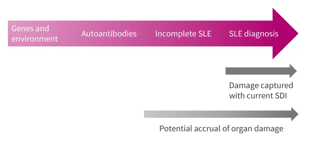 The SDI covers events after SLE diagnosis. However, organ damage could accrue in a prodromal period prior to official SLE diagnosis (Figure 3).4 With acknowledgment of the limitations of the existing SDI, an international collaboration is in progress between Systemic Lupus International Collaborating Clinics, the Lupus Foundation of America, and the American College of Rheumatology to update the SDI.4