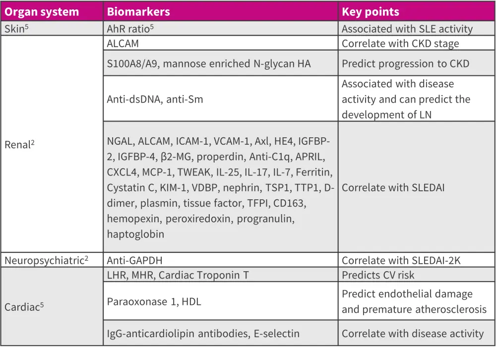 One critical aspect in the management of SLE is the identification of reliable biomarkers for early diagnosis, and for monitoring disease activity and prognosis.2 The key biomarkers for the commonly affected organ systems in SLE are summarized in Figure 4.
