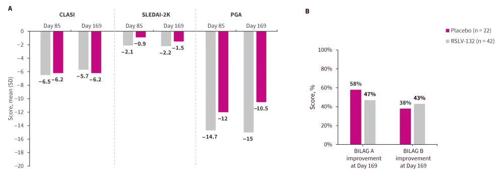 Figure 1. Change from baseline in A CLASI, SLEDAI-2K, PGA, and B BILAG*