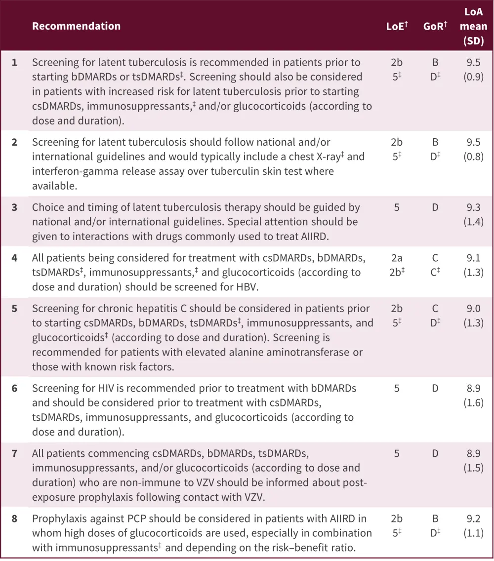 AIIRD, autoimmune inflammatory rheumatic diseases; bDMARDs, biological disease-modifying antirheumatic drugs; csDMARDs, conventional synthetic disease-modifying antirheumatic drugs; EULAR, European Alliance of Associations for Rheumatology; GoR, grade of recommendation; HBV, hepatitis B virus; LoA, level of agreement; LoE, level of evidence; PCP, pneumocystis pneumonia; tsDMARDs, targeted synthetic disease-modifying antirheumatic drugs; VZV, varicella zoster virus.