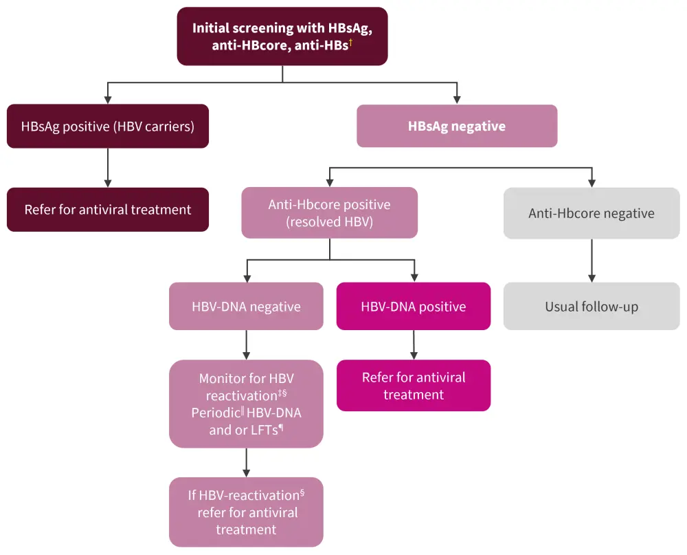 ‡Consider referral for antiviral prophylaxis for those commencing rituximab, having also low titers of anti-HBs. Risk is assessed on an individual basis.