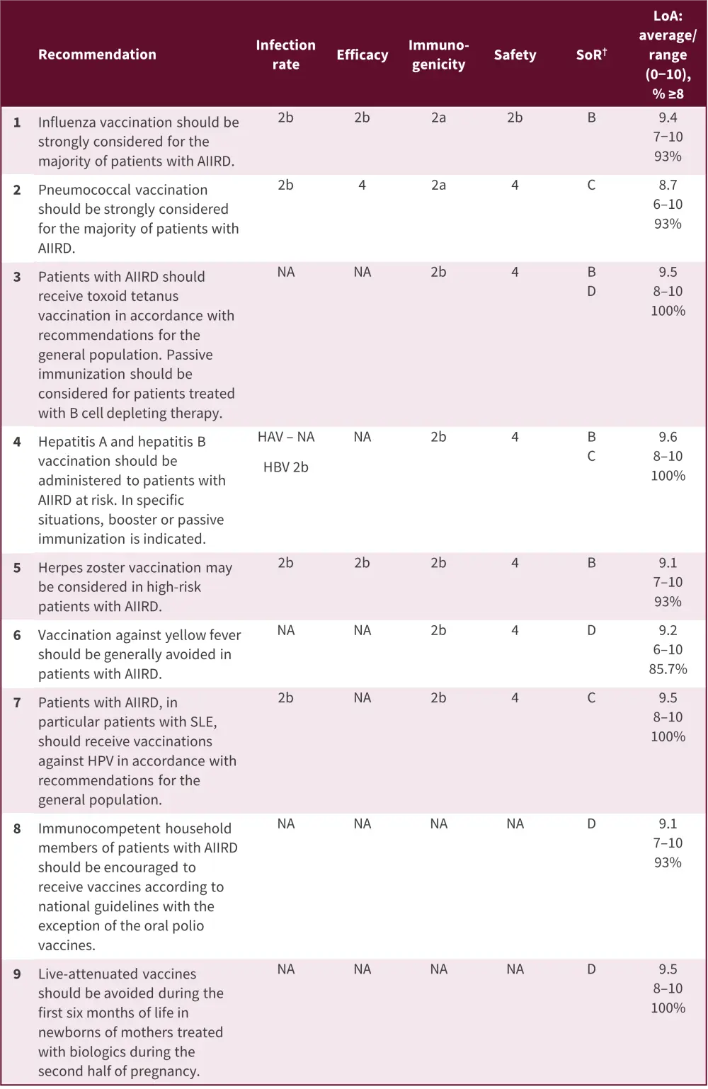 AIIRD, autoimmune inflammatory rheumatic diseases; EULAR, European Alliance of Associations for Rheumatology; HAV, hepatitis A virus; HBV, hepatitis B virus; HPV, human papilloma virus; LoA, level of agreement; NA, non-available; SLE, systemic lupus erythematosus; SoR, strength of recommendation.