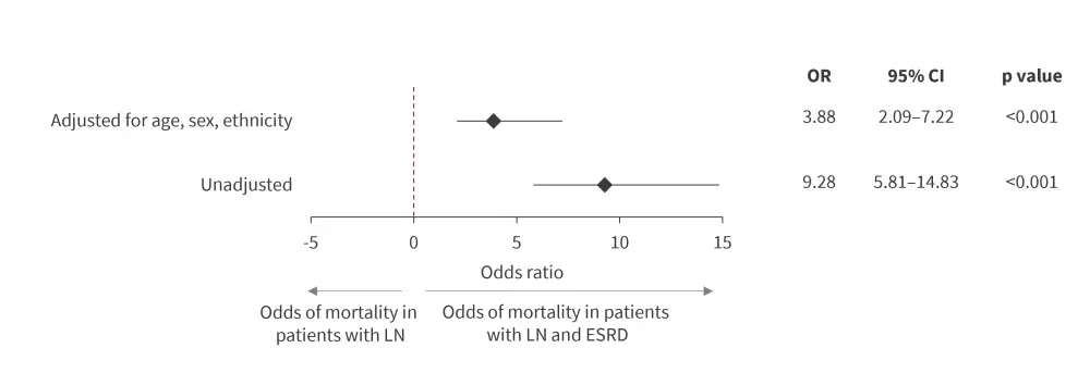 Figure 2. Odds of mortality among patients with LN and ESRD compared with patients with LN only*