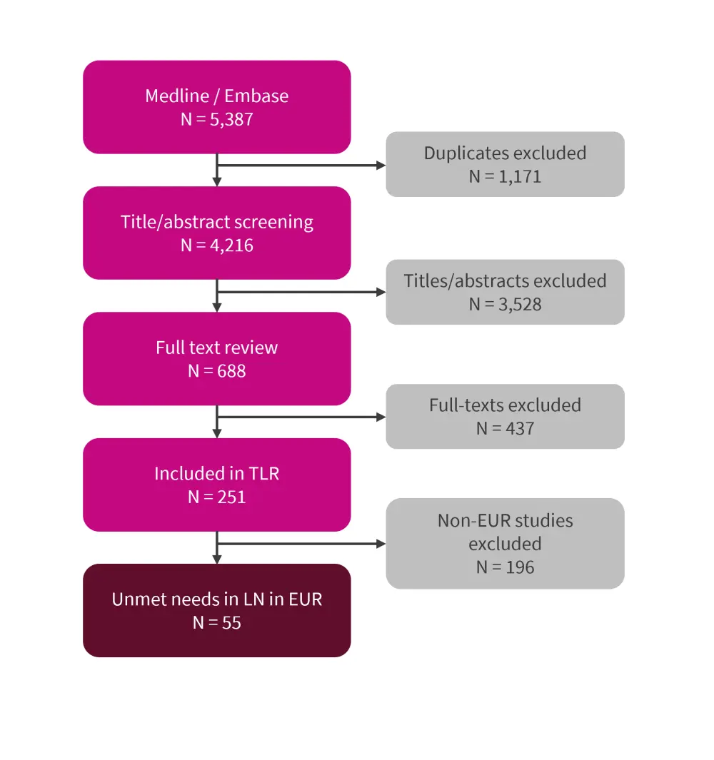 EUR, Europe; LN, lupus nephritis; PRISMA, preferred reporting items for systematic reviews and meta-analyses; TLR, targeted literature review.