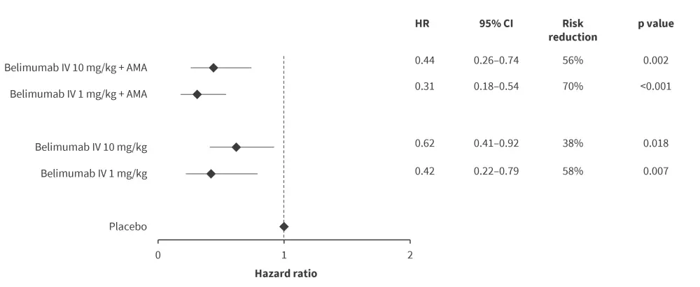 In the pooled analysis these studies, risk of renal flares was significantly lower in the belimumab group compared with the control group (Figure 1).1