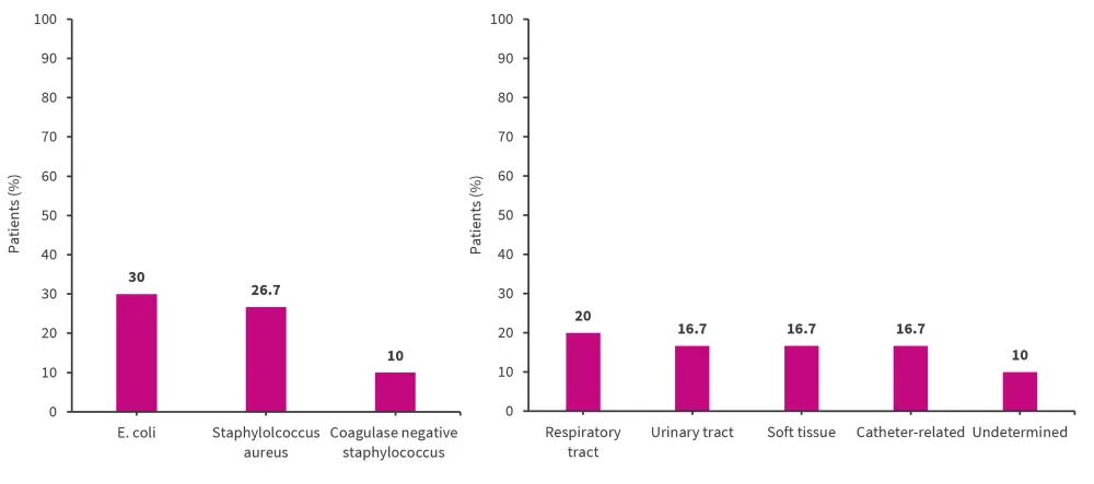 The most common infectious agent associated with BSIs was E. coli and the most frequent site of infection was the respiratory tract (Figure 1).