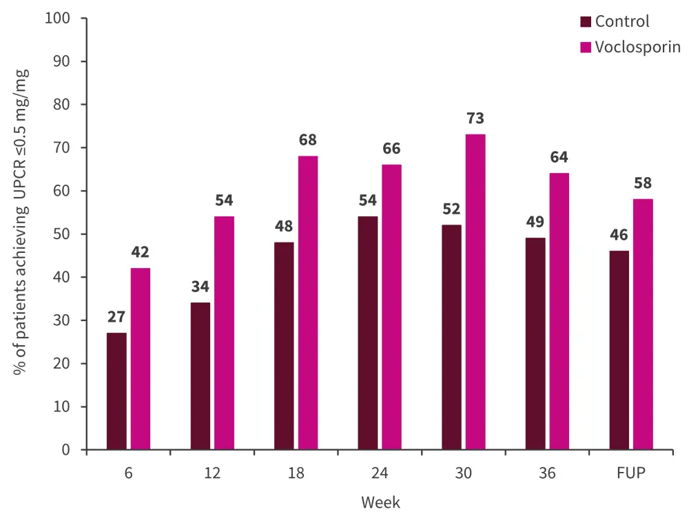 The reductions in urine protein creatinine ratio (UPCR) seen in AURORA 1 were maintained until the 4-week follow-up following study drug discontinuation of AURORA 2. More patients treated with voclosporin achieved a UPCR ≤0.5 mg/mg compared with the control at all time points (Figure 2).