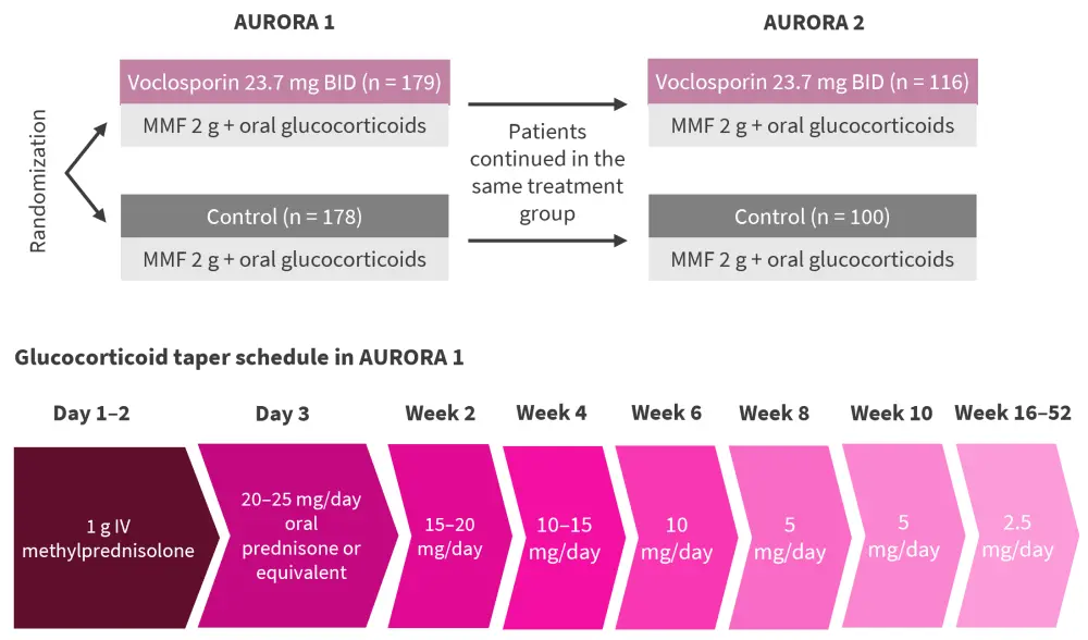 Figure 1. Study design of AURORA 1 and AURORA 2 and the glucocorticoid tapering schedule in AURORA 1*