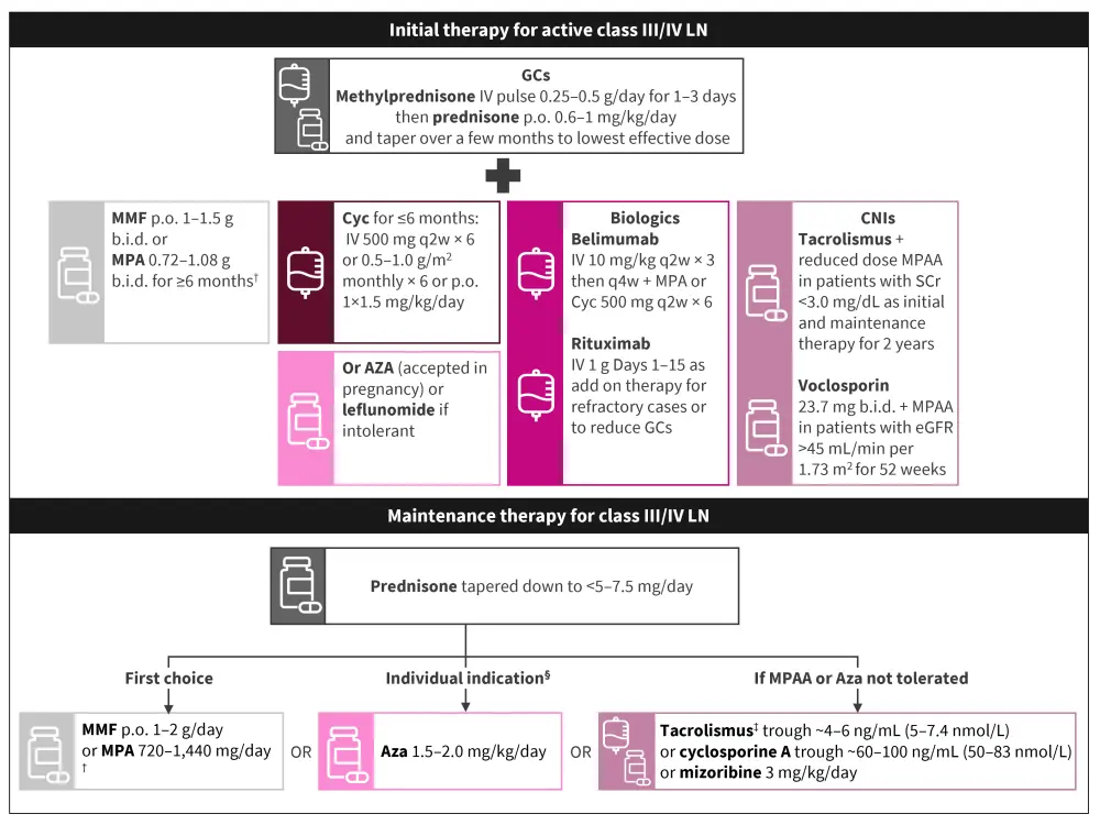 Aza, azathioprine; b.i.d., twice daily; CNI, calcineurin inhibitor; Cyc, cyclophosphamide; eGFR, estimated glomerular filtration rate; GC, glucocorticoid; IV, intravenous; LN, lupus nephritis; MMF, mycophenolate mofetil; MPA, mycophenolate acid; p.o., oral; q2wk, every 2 weeks; q4wk, every 4 weeks; SCr, serum creatinine.