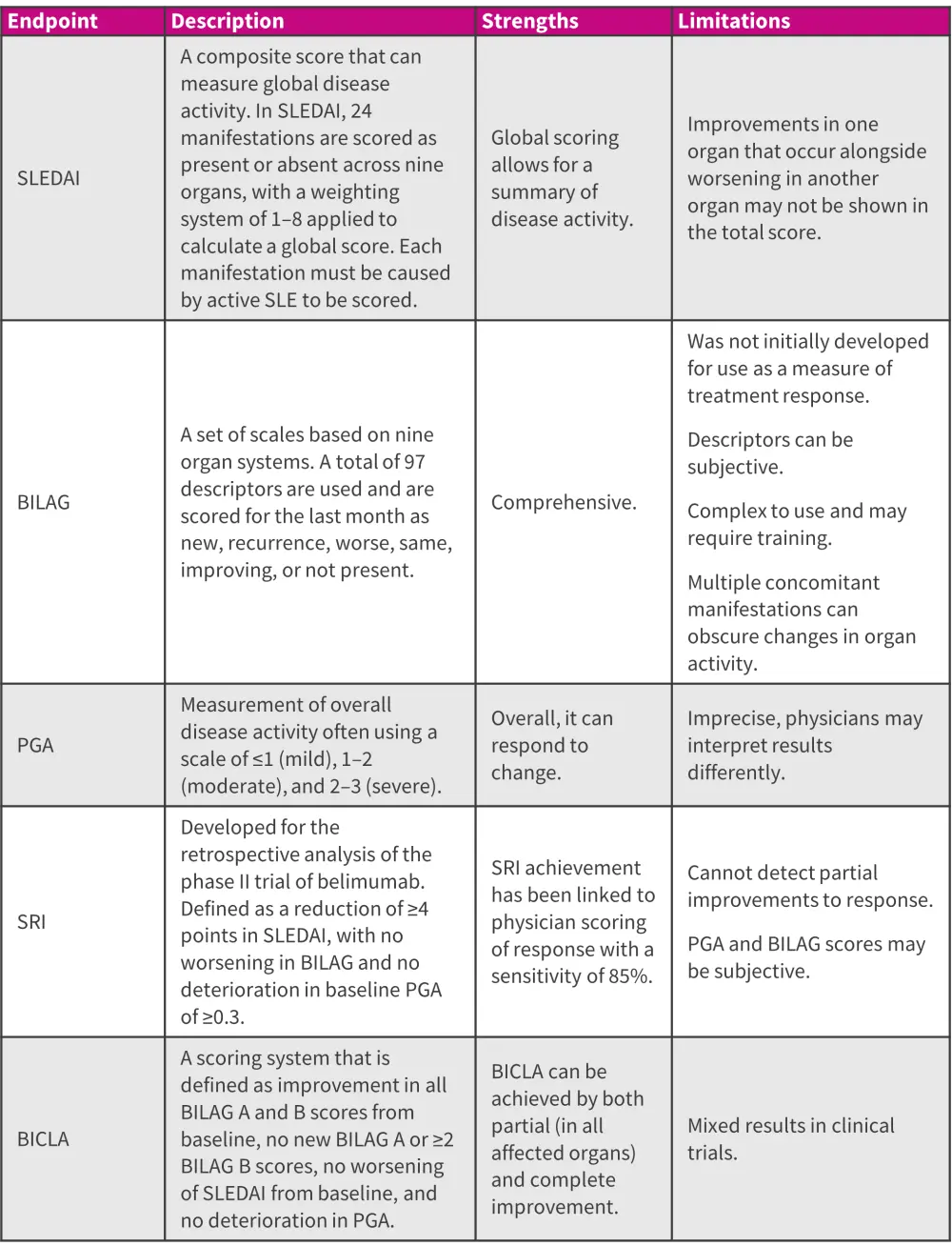 Figure 1 summarizes the current outcome measures used in SLE clinical trials.