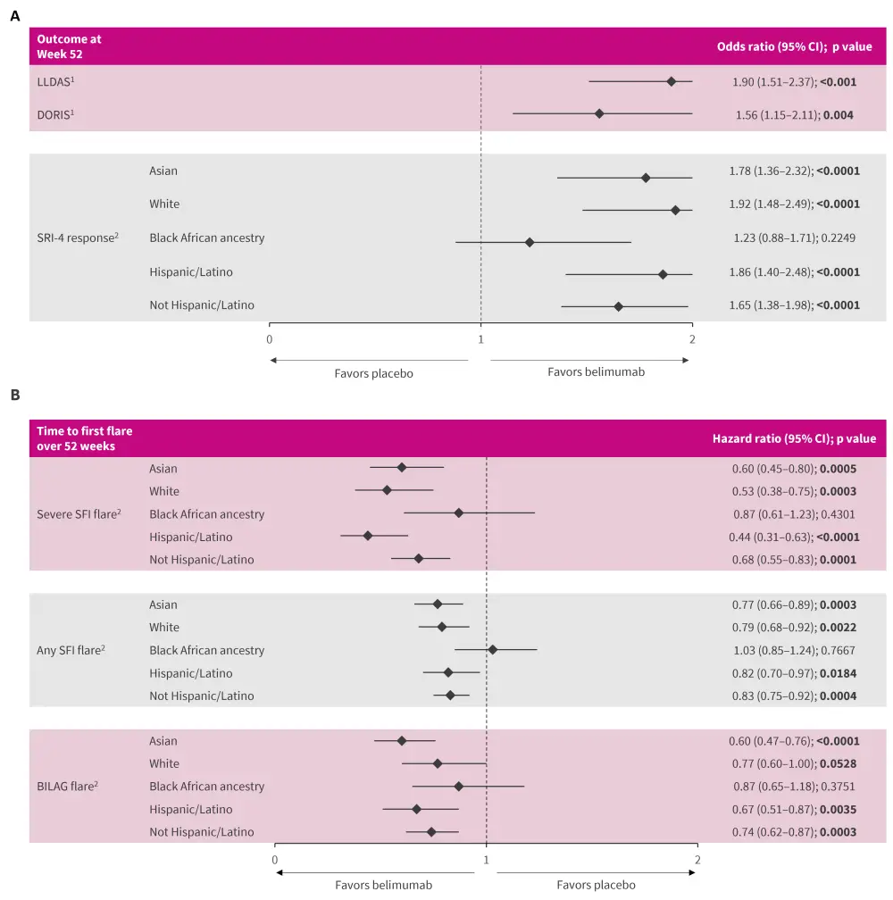 Included patients were treated with belimumab (10 mg/kg/month intravenously or 200 mg/week subcutaneously) or placebo, alongside standard therapy for 52 weeks. Parodis et al.1 analyzed the attainment of the definition of remission in SLE (DORIS) and Lupus Low Disease Activity State (LLDAS) with belimumab, while Sheikh et al.2 evaluated the efficacy of belimumab by race and ethnicity.
