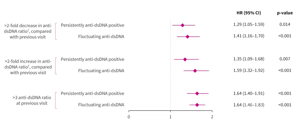 CI, confidence interval; dsDNA, double-stranded DNA; HR, hazard ratio; SLE, systemic lupus erythematosus.